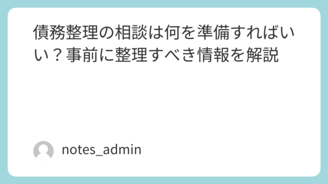 ②債務整理 債務整理の相談は何を準備すればいい?事前に整理すべき情報を解説 債務整理の相談前に準備すべき情報や流れを解説。借入状況の整理方法や相談で確認される内容、判断の考え方を初心者にも分かりやすく紹介します。 2026.02.05 ②債務整理④-1 相談の流れ④相談・手続き