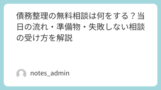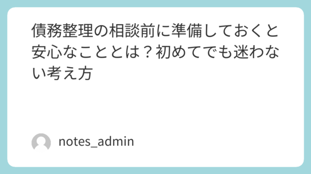 ④-1 相談の流れ 債務整理の相談前に準備しておくと安心なこととは?初めてでも迷わない考え方 債務整理の相談前に準備しておくと安心なポイントを解説。何を聞かれるのか、どこまで準備すればいいのかを初心者向けにわかりやすく紹介します。 2026.02.09 ④-1 相談の流れ④相談・手続き